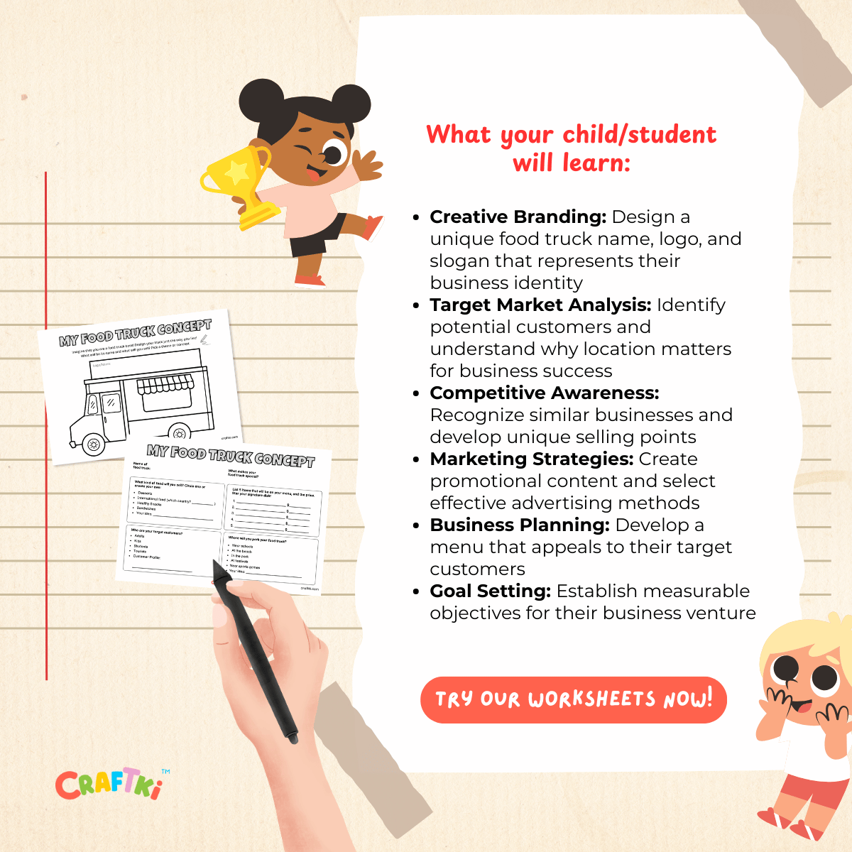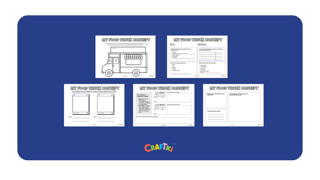 This worksheet aims to introduce children to fundamental business and marketing concepts through the creative process of designing their own food truck. By completing this activity, children will understand basic entrepreneurial principles while expressing their creativity and developing practical planning skills.