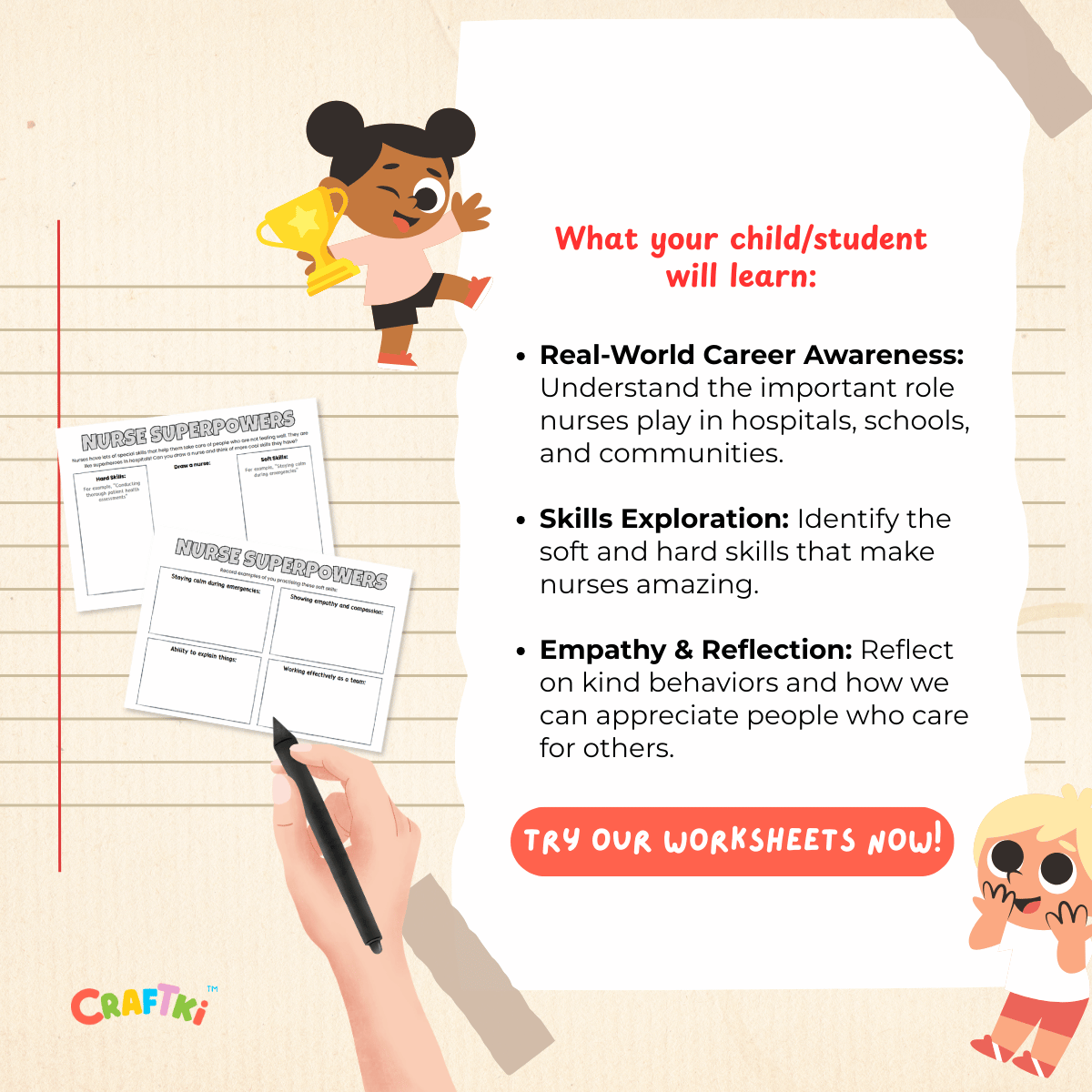 CRAFTKI beautifully designed worksheets are powerful learning tools designed to spark critical thinking, creativity, and real-world skills in kids. While most worksheets are one-dimensional, ours dive deep into a broad range of meaningful topics like environmental systems, entrepreneurship, and tech design—through fun, hands-on activities kids actually enjoy, made easy for busy parents and teachers. If you’re tired of boring worksheets, CRAFTKI is the upgrade your child’s learning deserves. Download now and see the difference.